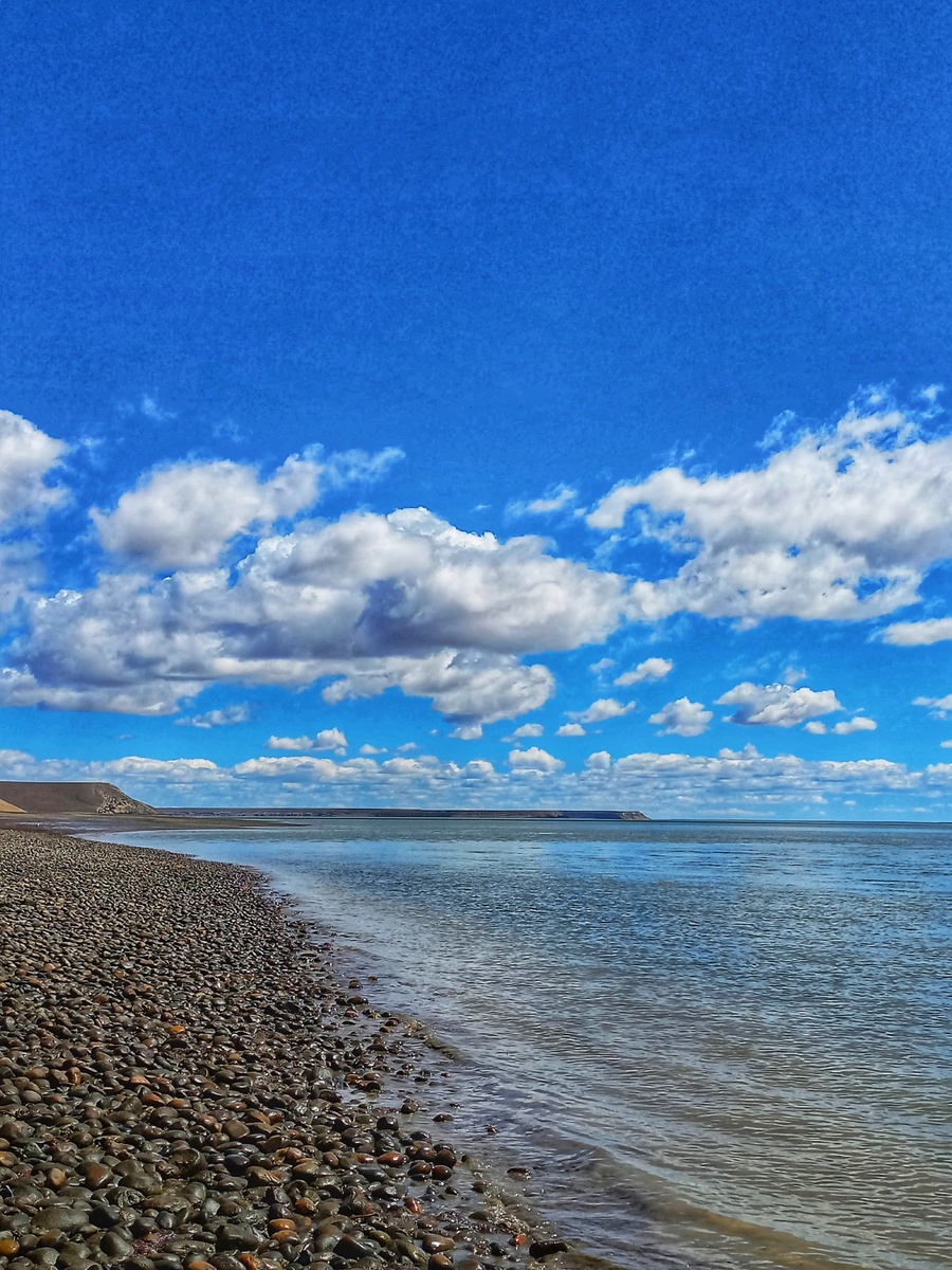 海水清澈,宛如一块巨大的蓝色玻璃,倒映着天空的湛蓝和云朵.