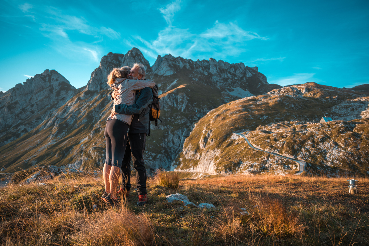 年轻夫妇拥抱在山中