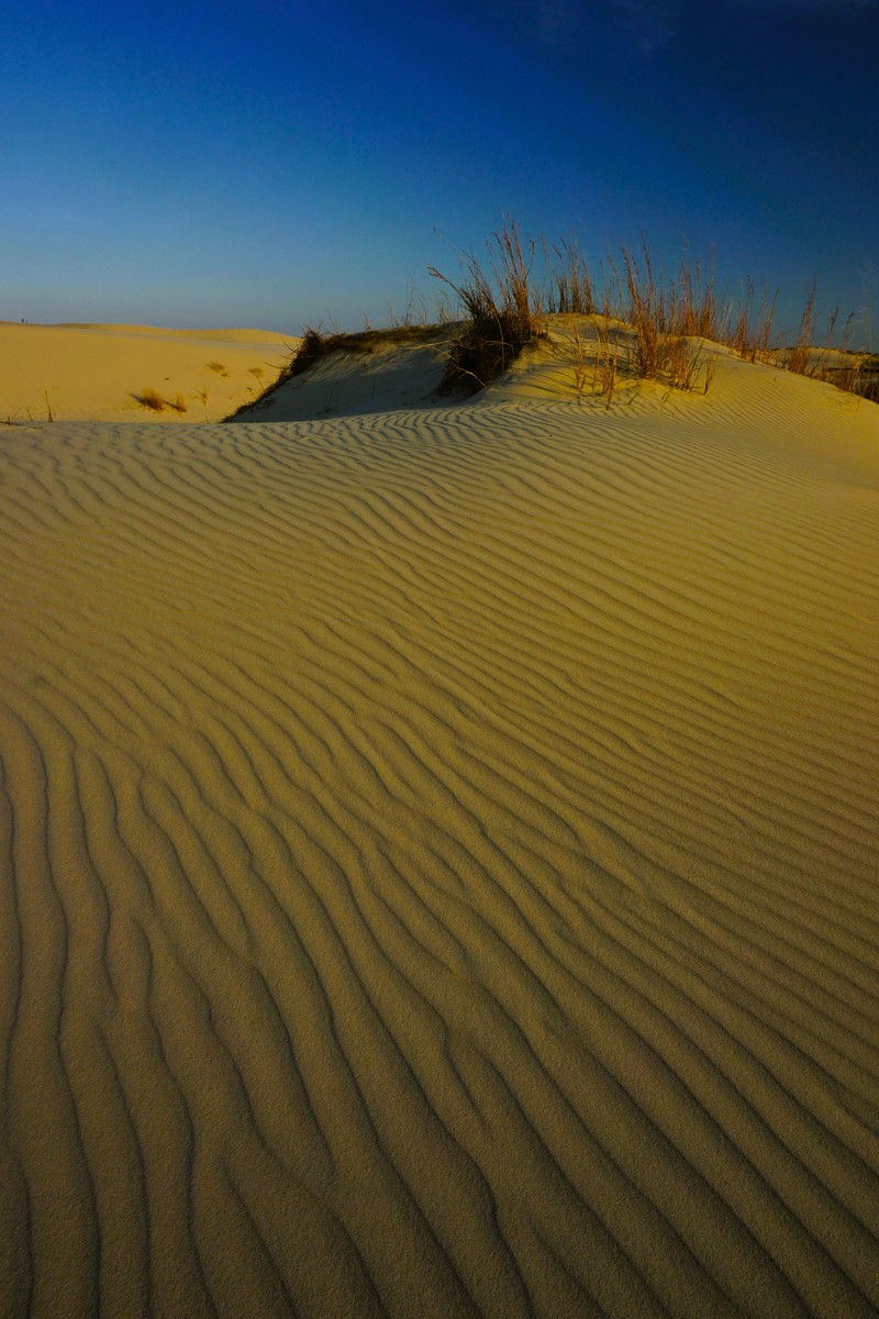 夕阳为连绵的沙丘镀上一层流动的金纱,光影在棱线间勾勒出柔美的曲线